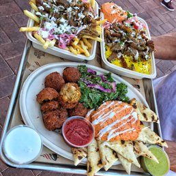 Was skeptical about coming to this place to eat. Walking in there was no line and we decided to place our order. I got the big plate with lamb meat, saffron rice, with fries. Food was delicious and they even had this red color hot sauce that had a little bit of kick to make the food more spicier. Establishment is clean with music at a good volume that you can still hear the conversation at the table. All in all a great experience. Try this place out if and when you get a chance.